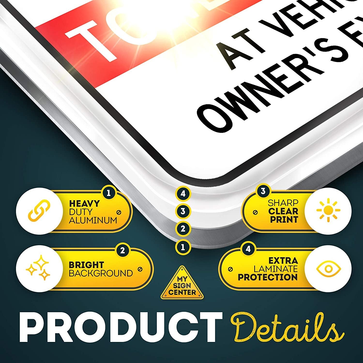 "Hi there! Welcome to the best Sign Manufacturer in the world, My Sign Center. We're a small sign manufacturing company based in New Jersey, USA with a passion for creativity. Being creative makes us happy and is what drives us to create beautiful signs that promote communication and safety. We truly believe in the life-changing power of creative designs and their ability to bring the world together in understanding. Great design and relationships come from collaboration and communication. Whether you are looking for no parking signs will be towed at owners expenses or any other sign we have a large selection of high-quality signs to choose from. At My Sign Center, we strive just for that. Making the world a better place one sign at a time. Our no parking tow away sign will always warn your employees, visitors or customers that they are on customers only no parking tow away zone, parking for customers only unauthorized vehicles will be towed at owners expenses. Perfect for indoor and outdoor use. This no parking sign is made out of .040 aluminum that won't rust and is printed with the highest quality UV inks with an extra layer of UV coating added to prevent your do not block driveway sign from fading as well as adding a nice glossy finish to enhance the look of your tow away zone sign. Pre-drilled holes in the center of the sign at the top and bottom makes it a perfect sign to be mounted on a post, fence, door, or wall. Thes no parking signs for business are octagon shaped and measures 14 inches high and 10 inches wide, The perfect size and shape to draw in attention to customer parking signs will be towed so no one can miss it. Help communicate your important message in a bright, safe, and easy to read way."