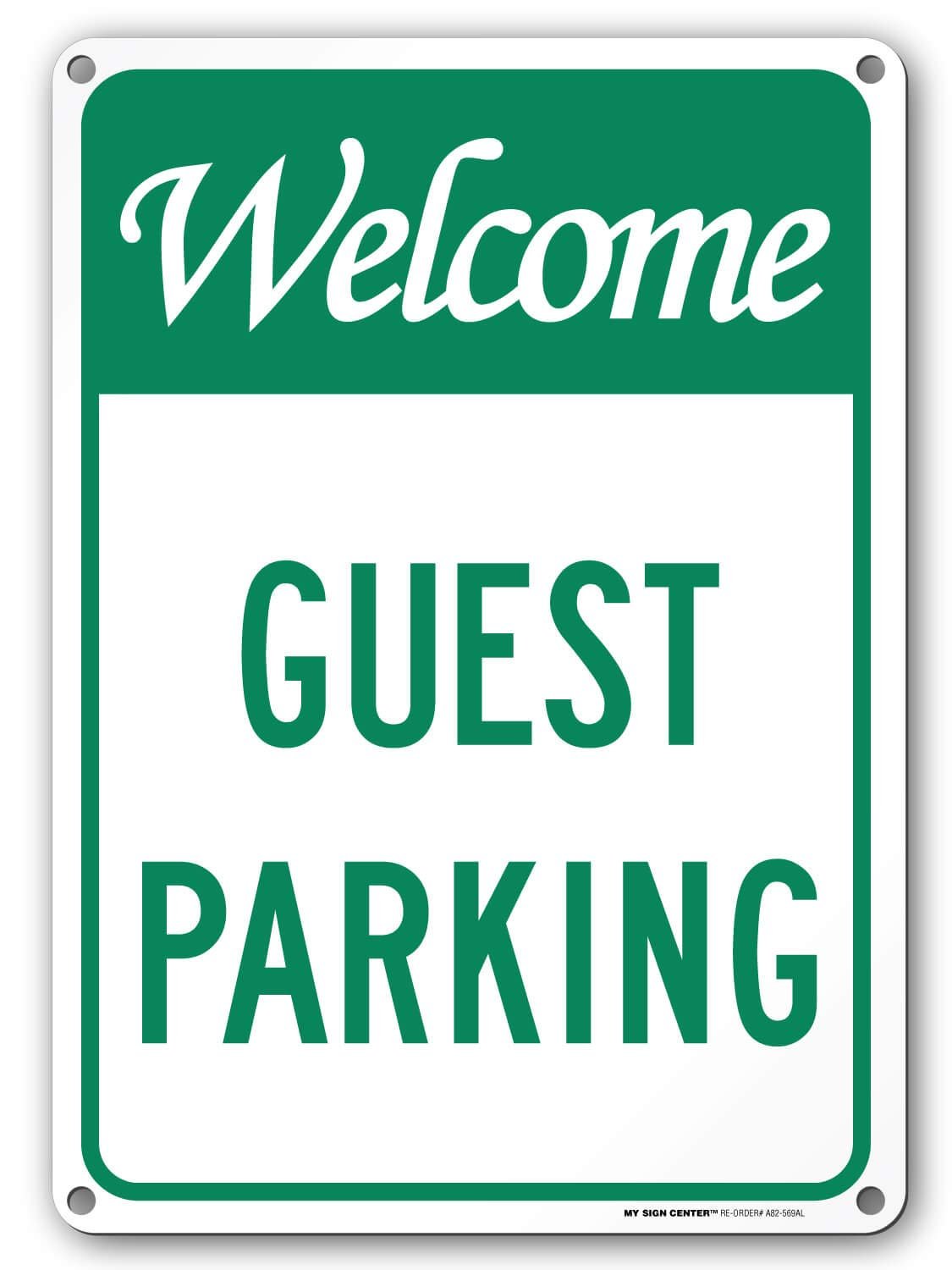 Being safe and making sure others are safe is always your number one concern when it comes to your family, home, and business. That's exactly why My Sign Center is committed to making signs that ensures the protection & safety of others. My Sign Center sign clearly states "Welcome Guest Parking" My Sign Center signs are proudly Made in the USA. This sign has a UV liquid clear gloss overlaminating that protects against damaging UV rays, moisture & scratching. UV Overlaminating resists temperature extremes, abrasion and chemical exposure for maximum label protection Aluminum signs have a service temperature range from 20 to 168 degrees F. This sign is made out of .040 rust free heavy duty aluminum This sign measures 14 inches high and 10 inches wide. This sign is screen or digitally printed with UV fade resistance ink and is weatherproof for indoor/outdoor use. This sign comes with pre-drilled holes in the four corners and each corner is rounded for easier handling.